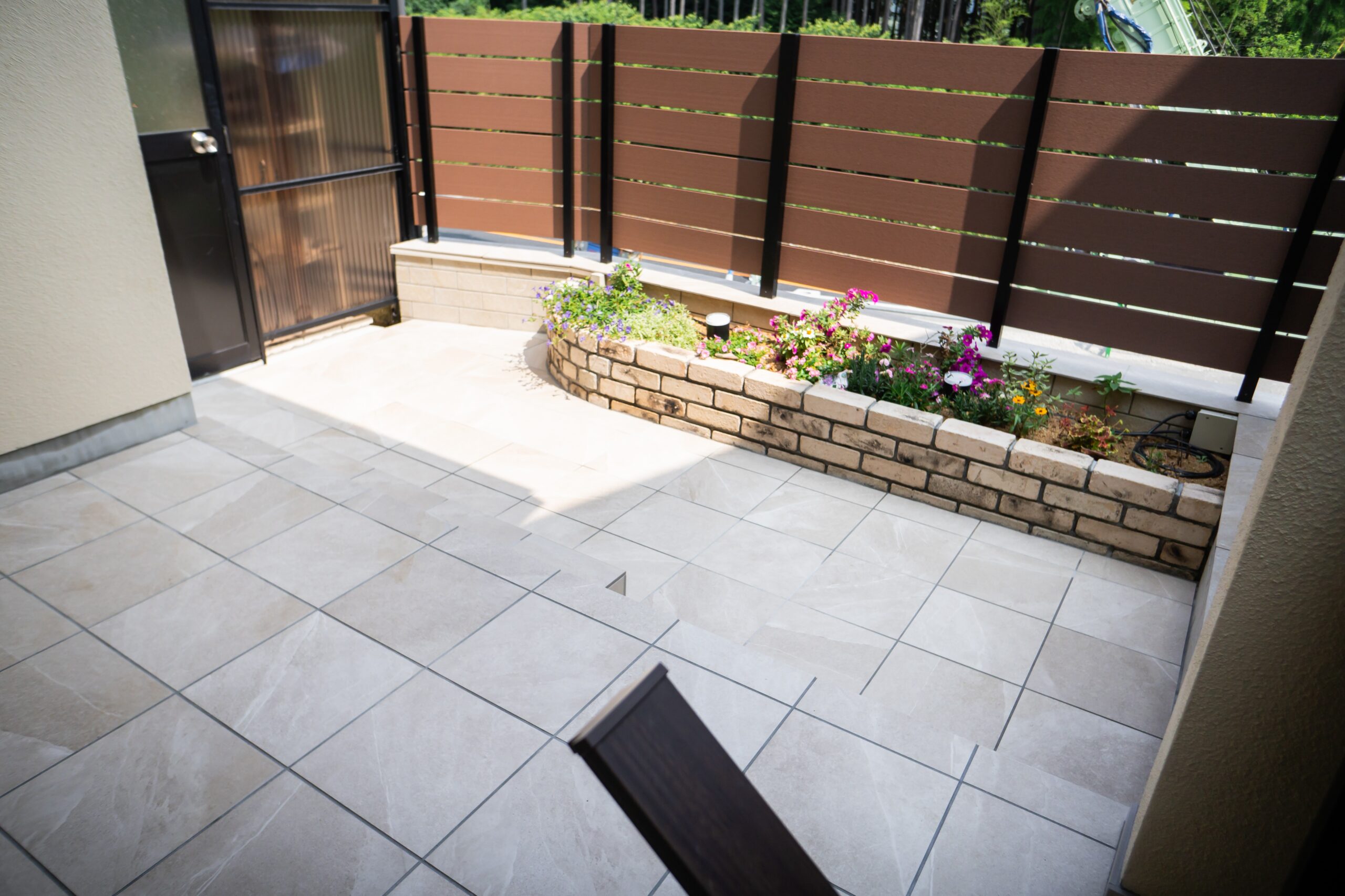 階段を上がったタイル敷きのお庭スペースにはレンガで花壇を設けました。